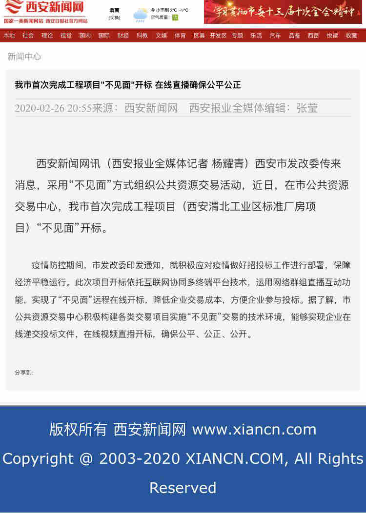 自抗擊疫情阻擊戰打響以來,我公司積極響應國家發改委《關于積極應對疫情創新做好招投標工作保障經濟平穩運行的通知》(發改電《2020》170號)、財政部《關于疫情防控期間開展政府采購活動有關事項的通知》(財辦庫《2020》29號)、市公共交易中心《疫情防控期間政府采購項目“不見面”開標工作辦法》等有關通知。公司全員一致高度重視,并在各級政府的關心和大力支持下,我司積極探索、主動承擔起了西安市首例電子化“不見面”開標模式,為了確保本次招標項目順利進行,我司領導與招標人、監管部門及市公共資源交易中心進行了深入的探討和溝通,并進行了多次模擬演練,于2020年2月25日上午在西安市公共資源交易中心順利實施了全過程電子化“不見面,在線視頻直播”的方式,對《臨潼渭北工業區標準工業廠房設計施工總承包》工程項目進行了公開招標(后附西安新聞網及發改委等有關官方報道)。