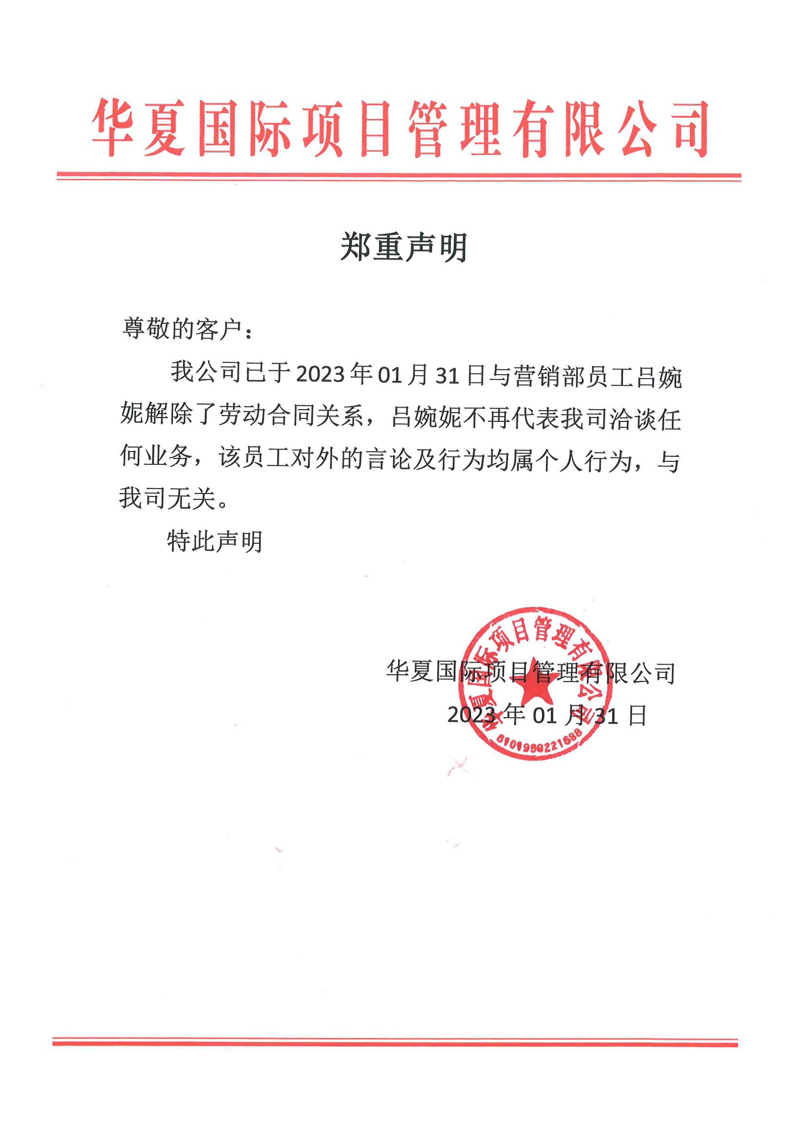 我公司已于2023年01月31日與營銷部員工呂婉妮解除了勞動合同關系,呂婉妮不再代表我司洽談任何業務,該員工對外的言論及行為均屬個人行為,與我司無關。