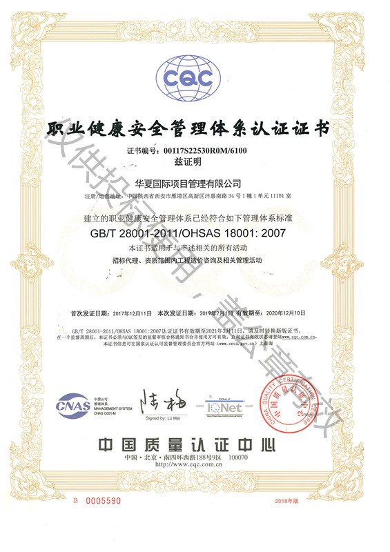 職業(yè)健康安全管理體系認(rèn)證證書